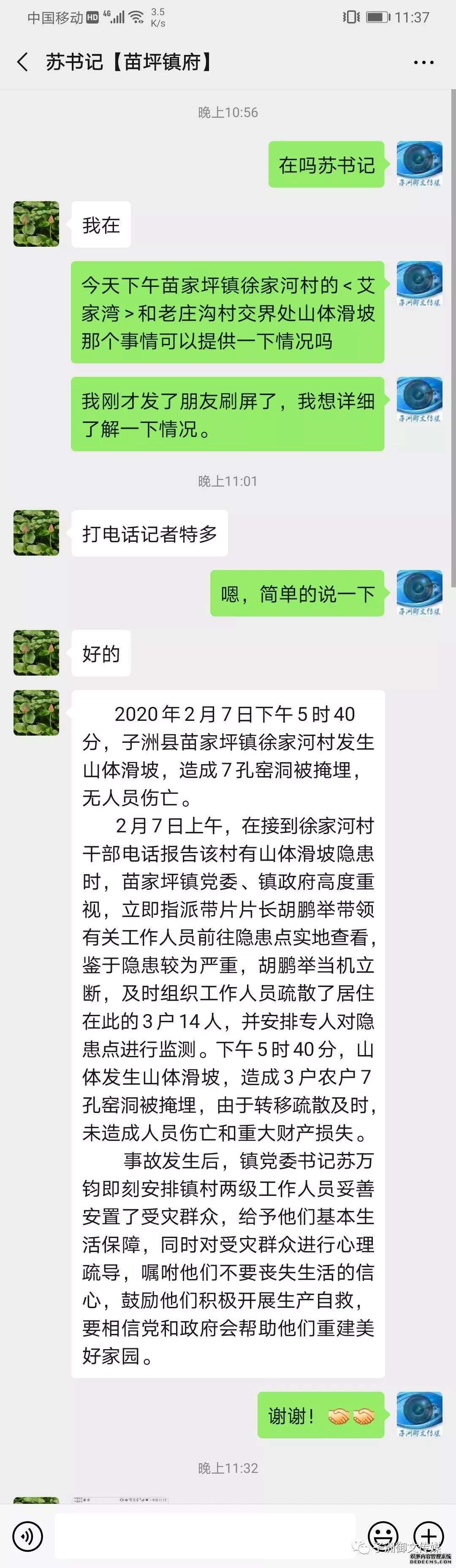 2月7日上午,在接到徐家河村干部電話報告該村有山體滑坡隱患時,苗家坪鎮(zhèn)黨委、鎮(zhèn)政府高度重視,立即指派帶片片長胡鵬舉帶領(lǐng)有關(guān)工作人員前往隱患點實地查看,鑒于隱患較為嚴(yán)重,胡鵬舉當(dāng)機立斷,及時組織工作人員疏散了居住在此的3戶14人,并安排專人對隱患點進行監(jiān)測。下午5時40分,山體發(fā)生山體滑坡,造成3戶農(nóng)戶7孔窯洞被掩埋,由于轉(zhuǎn)移疏散及時,未造成人員傷亡和重大財產(chǎn)損失。