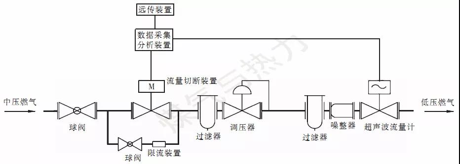 由于突發(fā)事故導(dǎo)致管道破損出現(xiàn)大量燃氣泄漏后的發(fā)現(xiàn)、響應(yīng)及處理時間十分關(guān)鍵,快速辨別管道漏氣,第一時間進行處置(如切斷上游供氣),可有效降低發(fā)生爆燃事故的風(fēng)險,尤其對于人口密集區(qū)域的庭院燃氣管道事故處理更加重要。本項目從管道出現(xiàn)較大泄漏產(chǎn)生流量異常作為切入點[1],重點研究解決兩個問題:第一是對泄漏的智能判斷,通過對埋地庭院管網(wǎng)流量異常變化的捕捉及辨識,對管道泄漏進行辨識。第二是實時性問題,及時發(fā)現(xiàn)泄漏后,快速報警、處置,縮短響應(yīng)時間。本項目考慮在燃氣中低壓庭院燃氣管道調(diào)壓箱處,安裝庭院燃氣管道泄漏報警切斷裝置解決上述問題。該裝置主要由數(shù)據(jù)采集分析裝置、流量切斷裝置、遠傳裝置、超聲波流量計、限流裝置以及球閥、過濾器、噪整器、太陽能電池系統(tǒng)等組成,見圖1,太陽能電池系統(tǒng)未畫于圖1內(nèi),其主要承擔(dān)數(shù)據(jù)采集分析裝置、遠傳裝置運行供電以及模塊間的通信供電。過濾器、噪整器及超聲波流量計安裝在調(diào)壓器后的低壓側(cè),流量切斷裝置安裝在調(diào)壓器和過濾器前,用于監(jiān)測管道瞬時流量變化。流量切斷裝置并聯(lián)一個球閥及限流裝置,當出現(xiàn)大流量泄漏需要切斷時,流量切斷裝置起快速切斷氣路的作用。有時調(diào)壓箱下游用戶較多,一旦完全停氣,復(fù)氣十分困難,在搶修作業(yè)允許管道微正壓操作時,遇到泄漏可以通過限流的方式處置,打開旁路球閥,通過限流裝置將瞬時流量限制在安全的范圍內(nèi)。庭院燃氣管道泄漏報警切斷(限流)裝置,除了數(shù)據(jù)采集分析裝置和遠傳裝置安裝在調(diào)壓箱外,其余均安裝在調(diào)壓箱內(nèi)。數(shù)據(jù)采集分析裝置通過線纜連接超聲波流量計與流量切斷裝置,實時采集超聲波流量計的流量信息,對管道流量進行監(jiān)控,當出現(xiàn)異常流量時,通過遠傳裝置將報警信息發(fā)送到燃氣公司的監(jiān)測平臺系統(tǒng)。在接到監(jiān)測平臺系統(tǒng)關(guān)閥指令,或數(shù)據(jù)采集分析裝置判斷出異常流量超過限定值時,數(shù)據(jù)采集分析裝置發(fā)送關(guān)閥指令,通過流量切斷裝置切斷氣路。庭院燃氣管道泄漏報警切斷(限流)裝置的泄漏識別主要包括兩種方式:一是白天及傍晚用氣時段,通過實時監(jiān)測瞬時流量變化識別突發(fā)較大的泄漏事故;二是夜間用氣低谷時段通過測算流量累積量識別小的泄漏。第一種方式是捕捉并辨識管道由于突然泄漏出現(xiàn)的異常流量變化。原理是將小區(qū)居民用戶正常用氣規(guī)律(瞬時流量變化量)與管道出現(xiàn)泄漏時流量異常變化進行比較,基于小區(qū)大部分用戶在同一時刻同時使用用氣設(shè)備為小概率事件,則管道由于突發(fā)事件出現(xiàn)較大泄漏時瞬時流量的變化理論上和正常用氣情況有所區(qū)別,即可識別的泄漏異常流量變化量應(yīng)遠大于小區(qū)居民正常用氣時的瞬時流量變化量。由于管網(wǎng)所供用戶規(guī)模不同,用戶用氣情況不同,這個可識別的泄漏異常流量變化量是個相對值,是由用戶用氣規(guī)律決定的。因此,需要在管道未出現(xiàn)泄漏的正常用氣負荷情況下,每天全時段實時采集用戶的瞬時流量,計算流量變化速率。由于不同季節(jié)用戶在每天各時段的用氣規(guī)律會有所不同,因此可按月記錄用戶一天24 h的瞬時流量和流量變化速率,瞬時流量采集時間間隔為5 s,也實時計算流量變化速率。將瞬時流量和流量變化速率的最大值作為特征值,建立各月的特征值表,并設(shè)定一個識別閾值。當進行泄漏識別時,將當前流量值及其變化速率與相對應(yīng)的特征值分別進行比較,當前流量值及變化速率分別減去對應(yīng)的特征值,得到的數(shù)值與對應(yīng)的特征值的比值再與閾值進行比較,二者均大于閾值時判斷為異常流量[2]。第二種方式是基于夜間用氣低谷時段的流量累積量在正常負荷時是一個很小的值,而持續(xù)的小流量泄漏在該時段所產(chǎn)生的累積量遠大于正常負荷時的累積量。優(yōu)先選擇幾乎無人使用燃氣的時段作為監(jiān)測時段,例如3:00—5:00時段,在管道未出現(xiàn)泄漏時,每天對該時段用戶的用氣累積量進行監(jiān)測記錄,用氣累積量是通過獲取瞬時流量累加得到。取該時段的最大用氣累積量作為特征值,同樣由于季節(jié)性原因,該時段用戶的用氣習(xí)慣會有所不同,因此應(yīng)按月分別建立最大累積量特征值表,并設(shè)定一個識別閾值。當進行泄漏識別時,被識別流量累積量減去特征值后與特征值的比值再與閾值進行比較,大于閾值時判斷為異常流量。數(shù)據(jù)采集分析裝置與超聲波流量計之間采用RS485進行通信。數(shù)據(jù)采集分析裝置儲存的數(shù)據(jù)包括至少5 d的瞬時流量歷史數(shù)據(jù)(采集時間間隔5 s)和不少于400 d的累積流量歷史數(shù)據(jù)(每30 min記錄一次)。儲存的瞬時流量歷史數(shù)據(jù)可用于事故分析,判斷泄漏的具體時間與泄漏量。儲存的累積流量歷史數(shù)據(jù)可對該調(diào)壓器所供用戶的負荷規(guī)律有所了解。數(shù)據(jù)采集分析裝置內(nèi)置泄漏識別程序,對采集到的用戶流量進行實時計算、處理、更新,具備自學(x