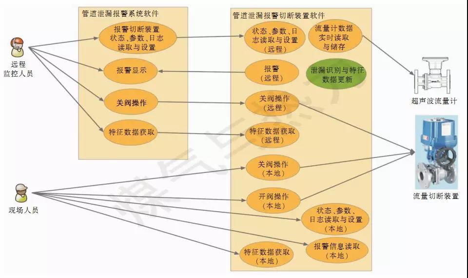 本系統(tǒng)選擇日本愛知AS超聲波流量計,為速度式流量計。其使用壓力小于等于1.0 MPa,防爆防護等級為EX ib IIB T4 Gb IP65,數(shù)據(jù)通信協(xié)議為RS485 MODBUS/RTU,精度等級為1.0級。超聲波流量計相較于其他類型流量計(如渦輪流量計),由于無轉(zhuǎn)動組件,不受慣性影響,對瞬時流量變化的靈敏度更高,且流量范圍較廣,始動流量較小,例如DN 50 mm口徑的超聲波流量計始動流量為0.37 m3/h,DN 100 mm口徑的超聲波流量計始動流量為1.25 m3/h。對小流量感知更靈敏,用于管網(wǎng)瞬時流量的監(jiān)測與捕捉,比較適合[5]。本系統(tǒng)選擇的遠傳裝置為山東思達特ST2000模塊,其負責(zé)太陽能電池系統(tǒng)供電管理和與燃氣公司的監(jiān)測平臺系統(tǒng)遠程通信。遠傳裝置采用RS485直讀方式從數(shù)據(jù)采集分析裝置獲取數(shù)據(jù),通過GPRS/CDMA無線通信進行遠傳,發(fā)送流量數(shù)據(jù)與報警信息,接收監(jiān)測平臺系統(tǒng)的指令,并下達到數(shù)據(jù)采集分析裝置。數(shù)據(jù)采集分析裝置與流量計、遠傳裝置、太陽能電池系統(tǒng)等連接。超聲波流量計自帶電池可單獨運行。整套供電系統(tǒng)可以正常運行6 a以上。 為實現(xiàn)流量監(jiān)測、泄漏識別、報警遠傳、遠程切斷等功能,系統(tǒng)軟件主要由本地管道泄漏報警切斷裝置軟件和遠端管道泄漏報警系統(tǒng)軟件兩部分組成。系統(tǒng)用例圖(軟件開發(fā)用于系統(tǒng)業(yè)務(wù)功能需求分析、系統(tǒng)建模的示意圖)見圖3,參與者包括:管道泄漏報警切斷裝置軟件、超聲波流量計、流量切斷裝置、管道泄漏報警系統(tǒng)軟件、遠程監(jiān)控人員、現(xiàn)場人員。其中,管道泄漏報警系統(tǒng)可以是其他的SCADA平臺系統(tǒng),這里只是為完成遠程泄漏監(jiān)測、報警、遠程切斷、參數(shù)設(shè)置等功能,所列舉的功能模塊。本文主要探討本地管道泄漏報警切斷裝置軟件的設(shè)計,即數(shù)據(jù)采集分析裝置主板的內(nèi)置程序,配合遠傳裝置實現(xiàn)相關(guān)功能。由圖3可知,管道泄漏報警切斷裝置軟件設(shè)計包括泄漏識別與特征數(shù)據(jù)更新,流量計數(shù)據(jù)實時讀取與儲存,狀態(tài)、參數(shù)、日志讀取與設(shè)置(遠程發(fā)送與本地操作),報警(遠程發(fā)送),關(guān)閥操作(遠程操作),特征數(shù)據(jù)獲?。ㄟh程發(fā)送與本地操作),報警信息讀?。ū镜夭僮鳎_關(guān)閥操作(本地操作)等程序功能組成。遠程監(jiān)控人員通過SCADA系統(tǒng)進行遠程交互操作?,F(xiàn)場人員通過數(shù)據(jù)采集分析裝置按鍵、顯示屏、SD卡進行本地交互操作[6]。