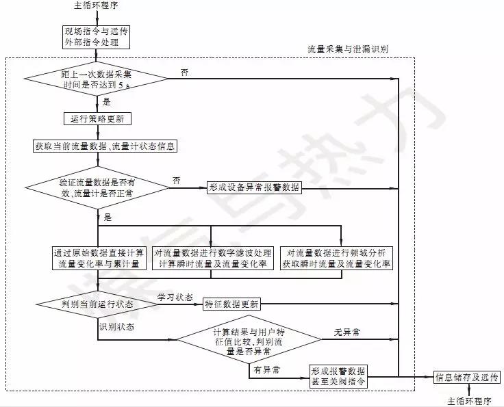為實現(xiàn)上述功能,本地管道泄漏報警切斷裝置軟件程序邏輯架構(gòu)由基礎(chǔ)層、技術(shù)服務(wù)層、應(yīng)用層3層組成?;A(chǔ)層包含各硬件操作的底層驅(qū)動程序,如數(shù)據(jù)采集分析裝置與流量計、遠傳裝置的RS485串口通信,SD卡數(shù)據(jù)的讀取與儲存,按鍵操作讀取等模塊。技術(shù)服務(wù)層為實現(xiàn)系統(tǒng)功能邏輯,提供相關(guān)的工具組件,調(diào)用基礎(chǔ)層的驅(qū)動程序接口,對數(shù)據(jù)進行解釋、加工處理,并向應(yīng)用層提供數(shù)據(jù)服務(wù)接口,方便功能邏輯的調(diào)用,包括開關(guān)閥指令處理、流量計數(shù)據(jù)采集與儲存、報警信息發(fā)送、報警數(shù)據(jù)儲存與讀取、參數(shù)信息儲存與讀取、數(shù)據(jù)的本地顯示、數(shù)據(jù)頻譜分析工具、時鐘校對等模塊。應(yīng)用層實現(xiàn)系統(tǒng)的邏輯功能,通過主循環(huán)程序周期循環(huán)調(diào)用流量采集與泄漏識別模塊、現(xiàn)場按鍵指令處理模塊、遠傳外部指令處理模塊,實現(xiàn)系統(tǒng)的自動運行與對外交互。主循環(huán)程序運行流量采集與泄漏識別模塊的程序流程見圖4。該部分為系統(tǒng)的核心功能之一,通過定時中斷程序?qū)崿F(xiàn)循環(huán)運行。進入主程序模塊后,首先判斷流量采集周期是否滿足,即當前時間距上一次流量采集時間是否滿足采集間隔(5 s),如果否,則跳出本次流量采集與泄漏識別操作;如果是,則執(zhí)行泄漏識別運行策略更新程序,檢查識別參數(shù)、指令是否有修改,并進行數(shù)據(jù)更新。從流量計獲取實時流量原始數(shù)據(jù)與狀態(tài)信息,檢查數(shù)據(jù)的有效性,例如報文中是否有報警或錯誤數(shù)據(jù),檢查流量計狀態(tài)是否正常。如果數(shù)據(jù)無效或流量計狀態(tài)不正常,則形成設(shè)備異常報警數(shù)據(jù),執(zhí)行信息儲存、遠傳。如果數(shù)據(jù)有效,則對數(shù)據(jù)進行計算處理及識別分析。計算處理過程包括3種方式,3種方式均通過原始流量數(shù)據(jù)計算某時段的流量累計值。對于原始流量變化比較平穩(wěn)即系統(tǒng)不存在調(diào)壓器喘振導(dǎo)致的流量頻繁波動時,可通過原始流量數(shù)據(jù)直接計算獲取流量變化率,速度較快,實時性較強。如果調(diào)壓器喘振導(dǎo)致流量波動干擾較大,則需要將喘振干擾部分濾掉后再進行下一步計算分析,可以對流量數(shù)據(jù)進行數(shù)字濾波處理或頻域分析處理,然后計算瞬時流量及流量變化率。數(shù)字濾波處理和頻域分析處理這兩種方法,去除干擾的原理不同,可以選擇其中一種方法,或兩者都使用,達到雙重保險的目的。這兩種方法實時性稍弱,但可有效降低喘振干擾造成的誤報。接下來判別當前運行狀態(tài),當數(shù)據(jù)采集分析裝置用于管網(wǎng)用氣規(guī)律搜集即學(xué)習(xí)階段時,程序不進行泄漏識別操作,而是直接生成并儲存用戶特征數(shù)據(jù)。當數(shù)據(jù)采集分析裝置用于管網(wǎng)泄漏監(jiān)測識別時,程序?qū)斍坝嬎憬Y(jié)果與用戶特征值進行比較,判別流量是否異常,當有異常時,形成報警數(shù)據(jù)甚至關(guān)閥指令,之后執(zhí)行信息儲存、遠傳等后續(xù)主程序指令,完成一次循環(huán)。