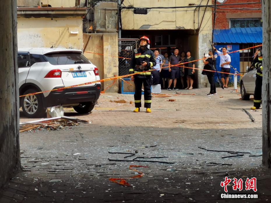 爆炸造成路邊多輛車輛受損,附近居民樓玻璃被沖擊波震碎。事故原因正在調(diào)查當(dāng)中。圖為消防人員在清理附近居民樓存在隱患的玻璃窗。中新社記者 范英杰 攝