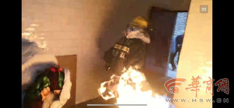 救援現(xiàn)場(chǎng)消防員從居民家提著著火的煤氣罐,一路跑出院外,經(jīng)過(guò)用厚毯子、濕抹布等,最終將煤氣罐上的明火撲滅。隨后,消防員慢慢擰開(kāi)煤氣罐進(jìn)行檢查確認(rèn)。