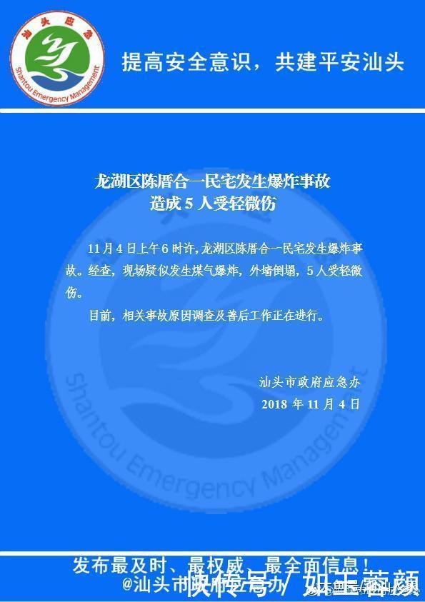 據(jù)“汕頭市政府應(yīng)急辦”發(fā)布通報稱:2018年11月4日上午6時許,汕頭龍湖區(qū)陳厝合一民宅發(fā)生爆炸事故。經(jīng)查,現(xiàn)場疑似發(fā)生煤氣爆炸,外墻倒塌,5人受輕微傷。目前,相關(guān)事故原因調(diào)查及善后工作正在進行。