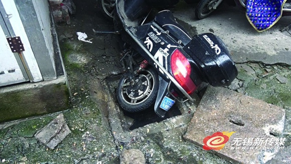 現(xiàn)場了解到,這次自行“跳躍”的窨井蓋數(shù)目不少,不過事故的動靜不大,只有窨井蓋周圍有崩壞的痕跡,掉落下一些水泥塊,周圍并無燃燒跡象,也沒造成人員受傷。要說最“嚴(yán)重”的,則是其中一個窨井旁停放的電動車,被彈起的窨井蓋撞倒(見圖)。
